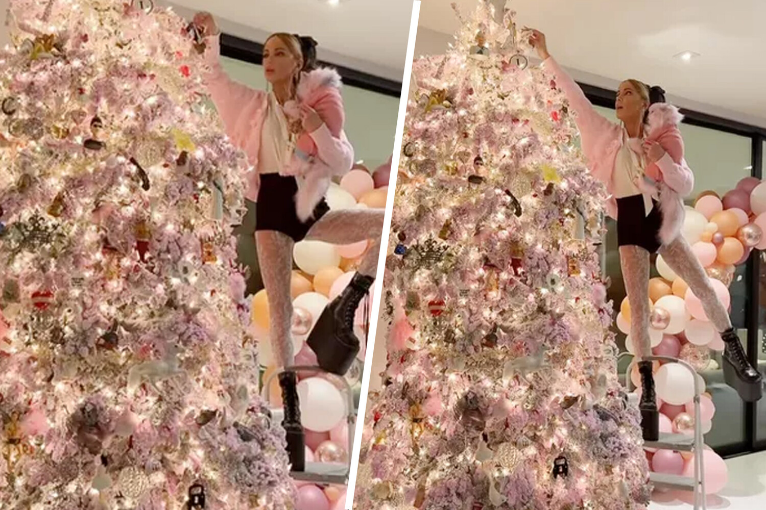 Знаменитость выбрала для праздничного декорирования изысканный образ: стильные черные шорты с акцентированной высокой талией, изящные белые кружевные колготки и уютный розовый кардиган. Великолепный образ дополнила безупречная прическа в виде высокого пучка и выразительный макияж. Особый шарм моменту придал пушистый питомец актрисы — кот, облаченный в милый праздничный свитер.