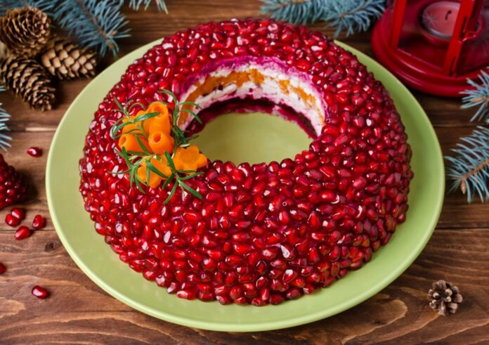 Соедините майонез (3-4 ст.л.) с давленым чесноком (2 зубчика) и равномерно покройте салат. Для эстетики и легкой кислинки украсьте зернами граната (половинка фрукта). Дайте блюду настояться 15 минут — этого достаточно, чтобы слои «подружились», но сухарики останутся рассыпчатыми.